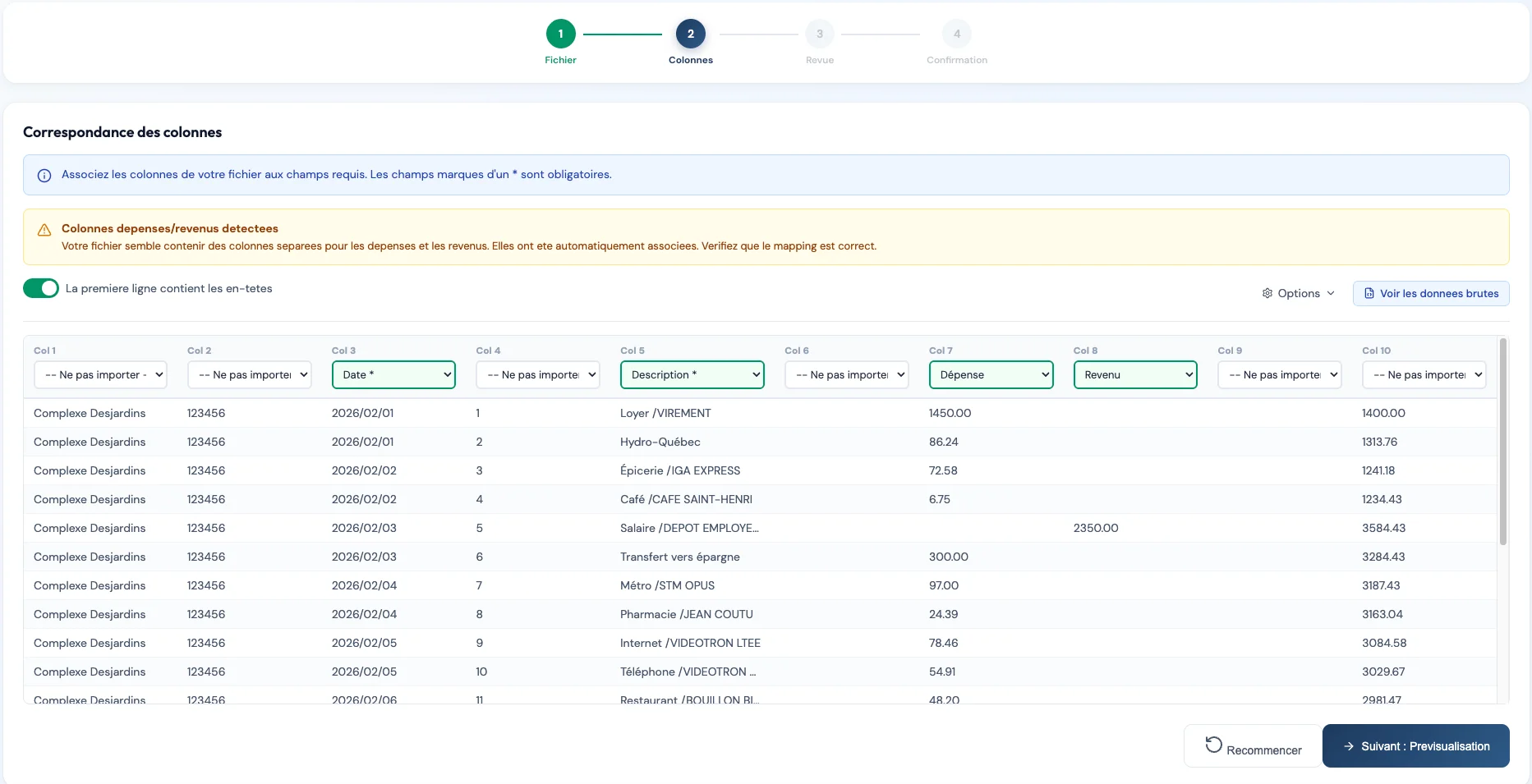 Association des colonnes CSV Validez attentivement les mappings détectés. Si votre CSV contient une seule colonne de montant, mappez-la au champ Montant. S’il contient deux colonnes (dépenses et revenu), sélectionnez les mappings correspondants pour chacune.