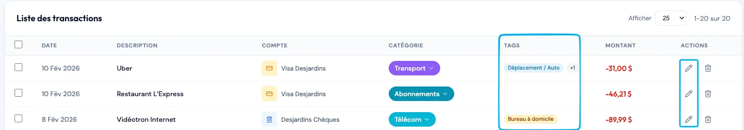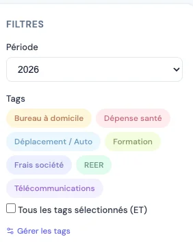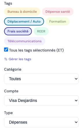 Ouvrez une transaction, ajoutez un ou plusieurs tags fiscaux, puis enregistrez.